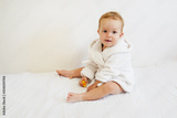 pretty baby with a white bathrobe after taking a bath sitting on white cover on white background
