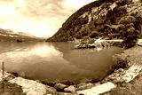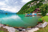 Traditional wood house and boats on the Lake Brienz in swiss village Iseltwald, Switzerland