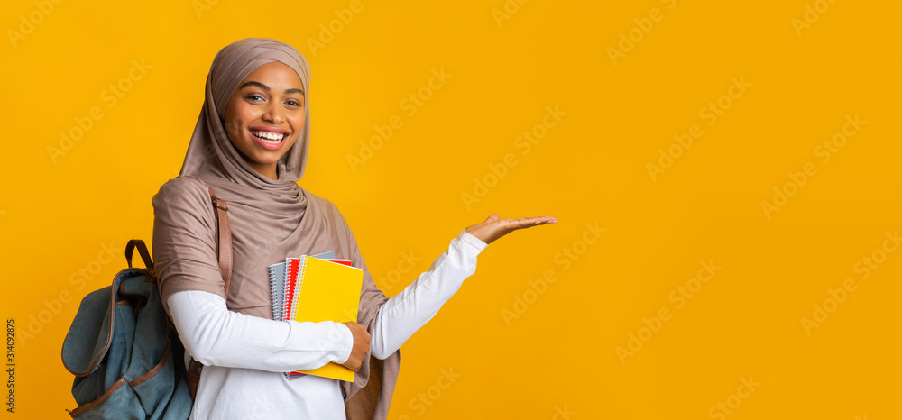 Cheerful black islamic female student in hijab pointing aside with hand