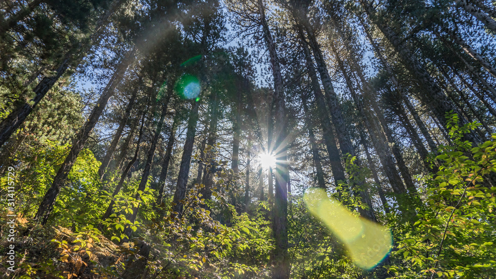 Sunbeams shine thru pine trees forest landscape, Cyprus