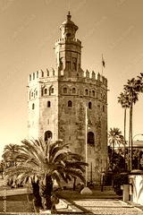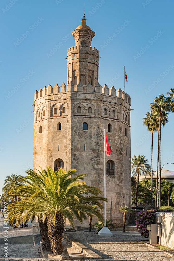 View of Golden Tower in Seville, Andalusia, Spain. Used as a military Moorish watchtower along the Guadalquivir river