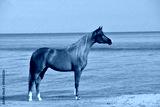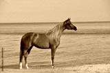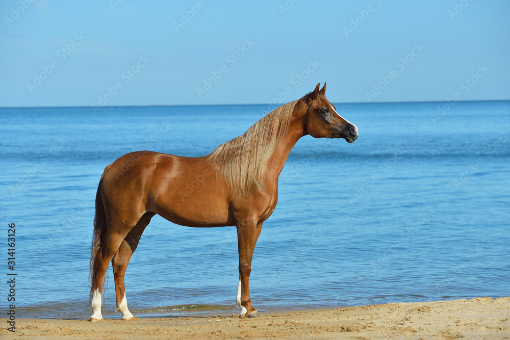 Chestnut arabian breed horse stands on the beach free in summer with bright blue sky in the background. Animal portrait.