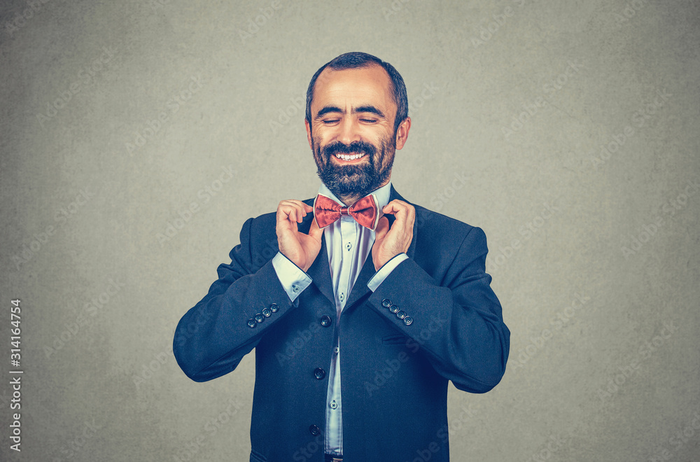 bearded man with dark suit, blue shirt, adjusting red butterfly bow, tie