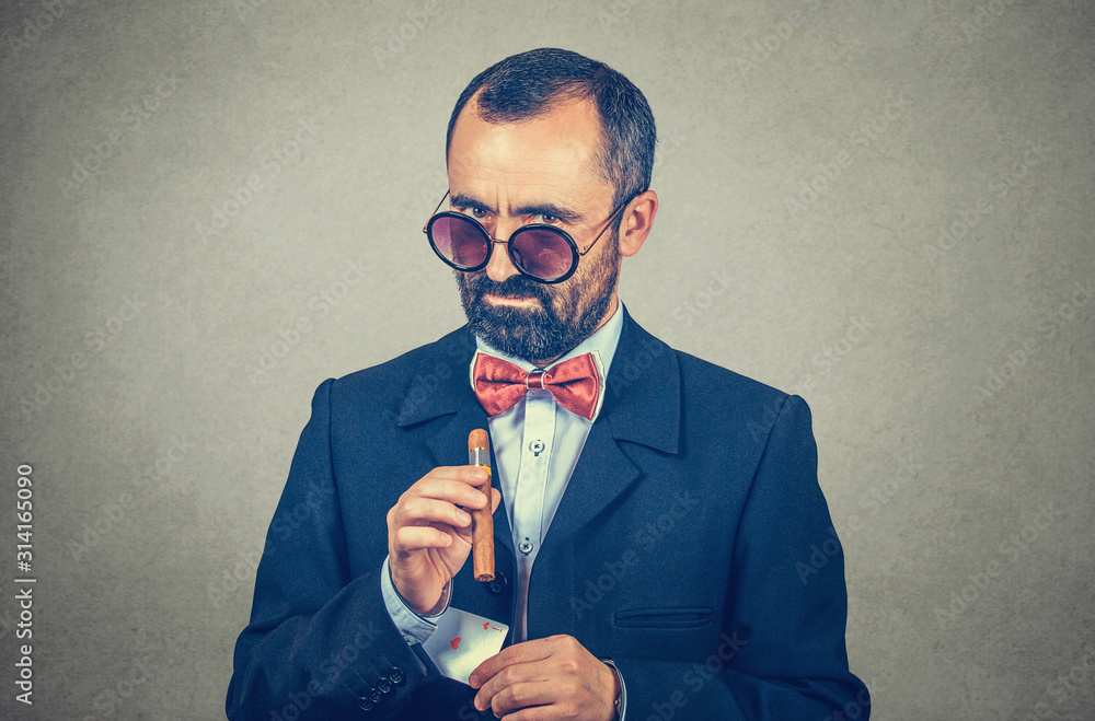 man looking over sunglasses with a cigar pulling out an ace out of his slleve
