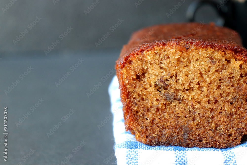 Homemade banana bread and slice on a table close-up. Christmas cake with holiday background