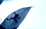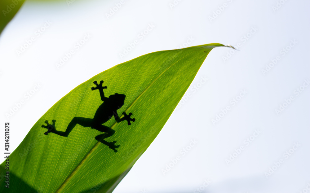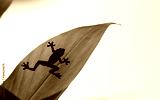 Shadow of a frog across a green leaf