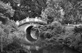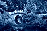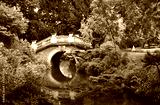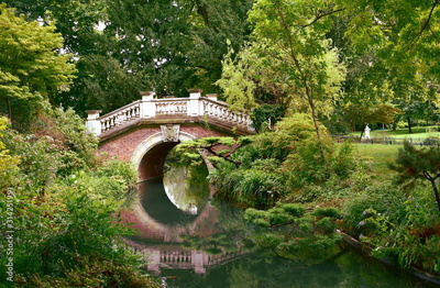 Bridge and river with water reflections in Parc Monceau. Paris, France.