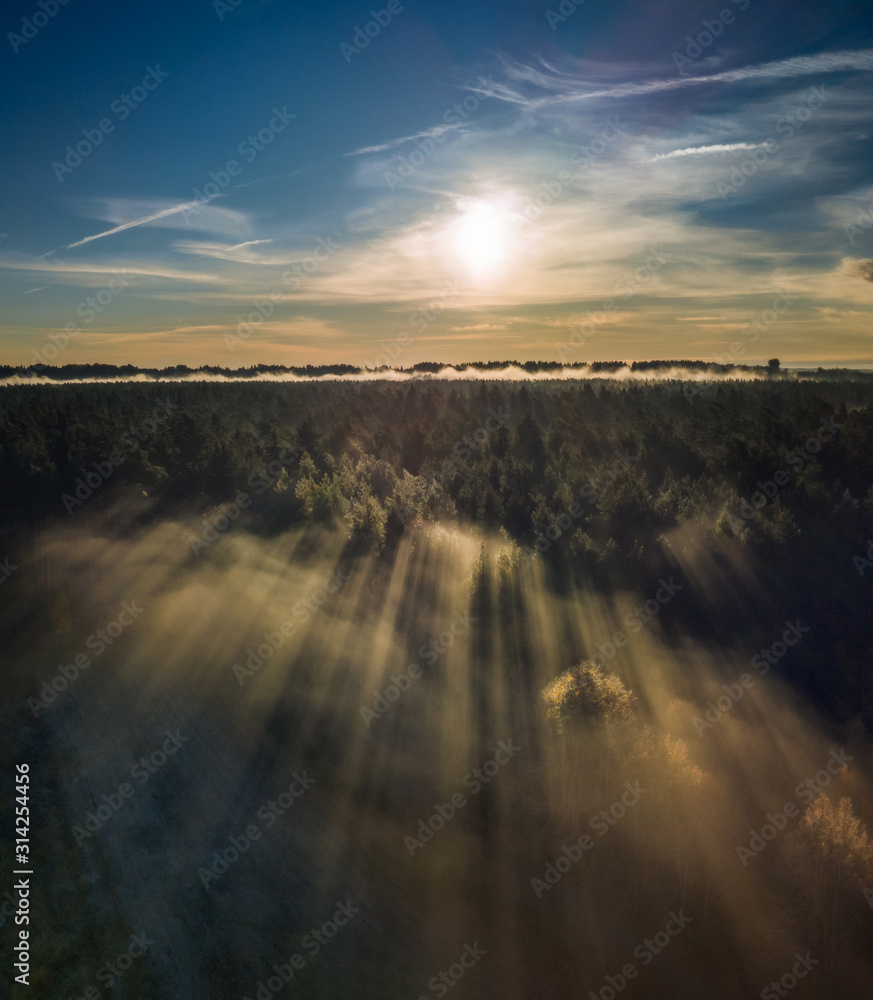 Aerial view of epic light rays over the forest at Autumn