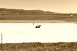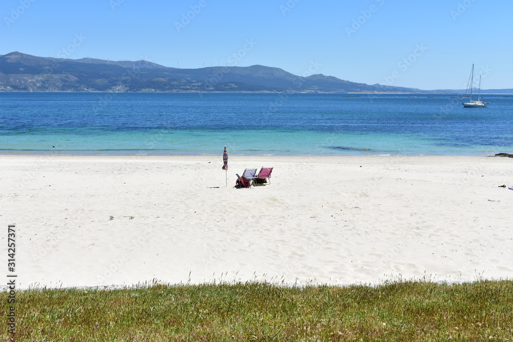Beach with grass, white sand, chairs and beach umbrella. Bay with turquoise water and sailing boat. Cee, A Coruña Province, Spain.