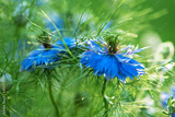 Macro shot garden blue flowers of love-in-a-mist or ragged lady or devil in the bush. Nigella.