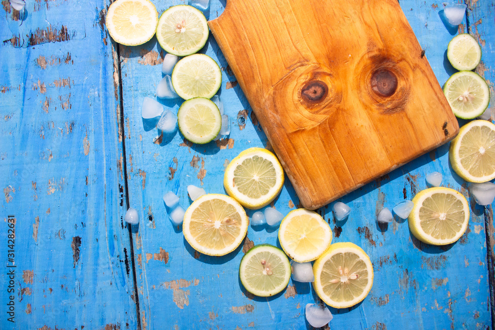 Sliced Lemons and Limes with ice cube. Over blue wood table background with copy space ,spring time concept