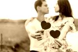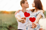 Young loving couple hugging near lake with red paper heart in hand.