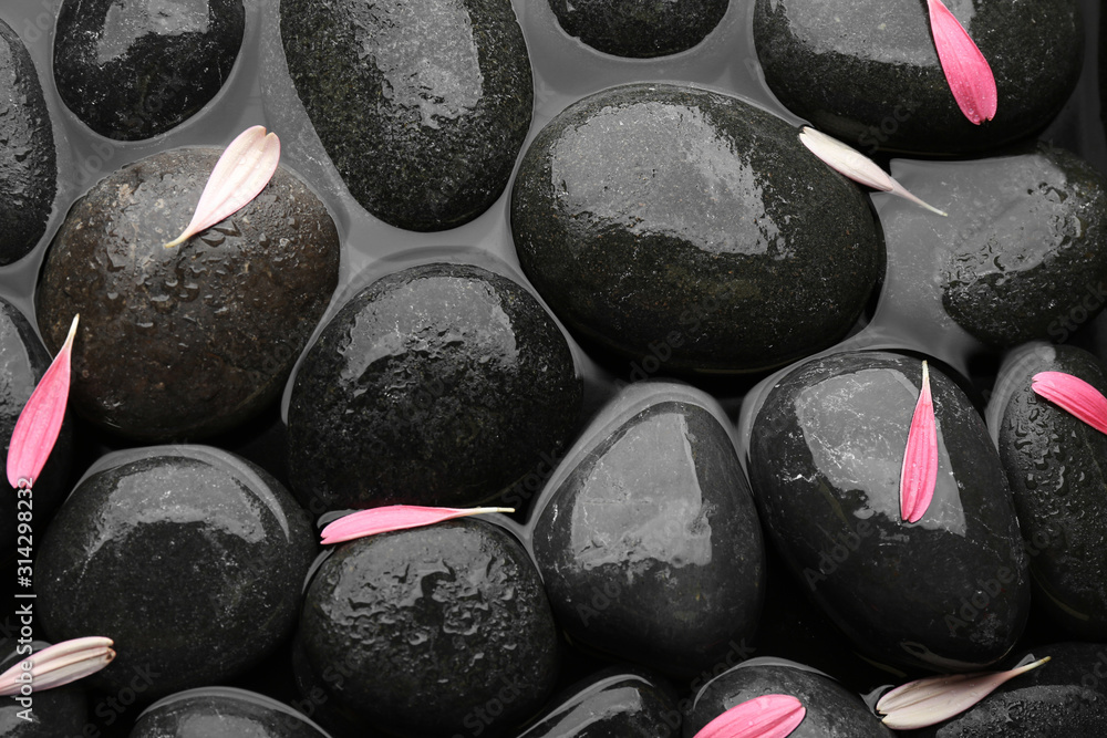 Spa stones with pink flower petals in water, top view. Zen lifestyle