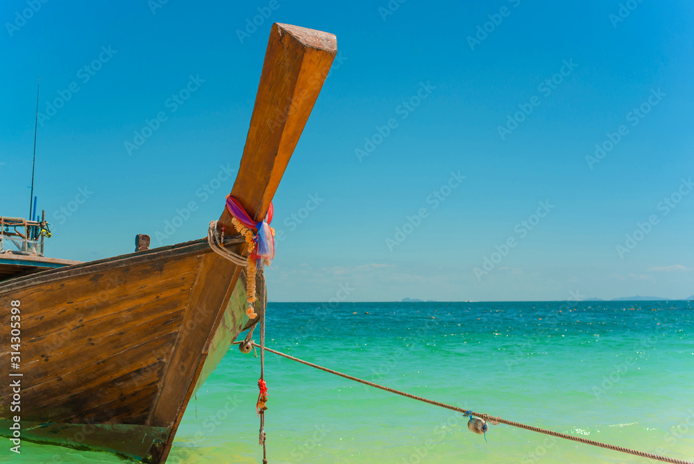 Traditional Thai longtail boat moored on exotic beach.