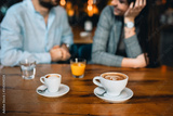 close up of cappuccino and espresso coffee in restaurant, happy couple in blurred background