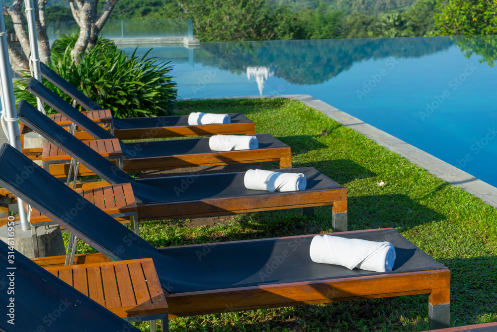 Wooden daybed place on wooden floor beside swimming pool in the resort with green natural in background.