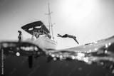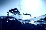 Young man jumps into the sea from the sail boat, splitted over under image with the crystal clear sea