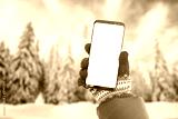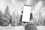 Phone mockup in hand with gloves. Winter, cold time with a lot of snow in mountain. Isolated screen for mockup, app promotion. Snowy trees in background