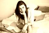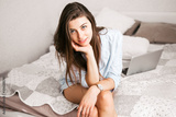 Young smiling woman sitting on bed in her bedroom. Happy morning.