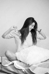 Young smiling woman doing workout on bed in her bedroom. Happy morning.