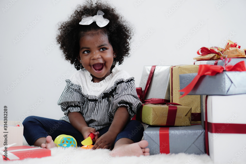 black girl child playing toy from present box in white room