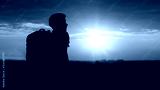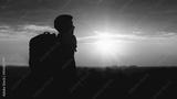 silhouette of man hiker standing on rocky mountain peak with sunset golden sky feeling of freedom