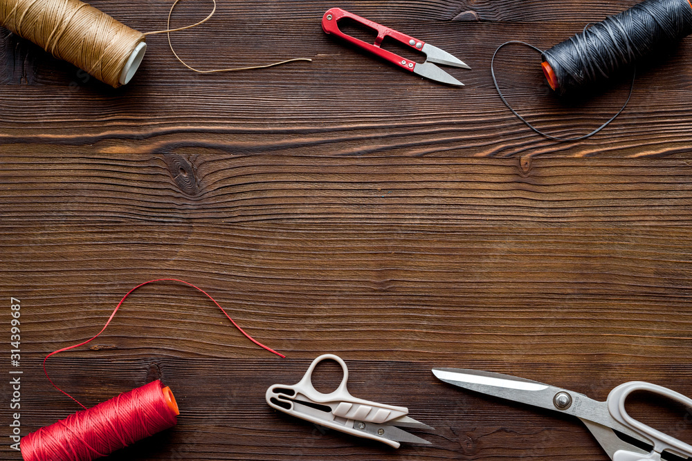 Tailor's work desk. Thread and sciccors on dark wooden background top-down copy space