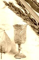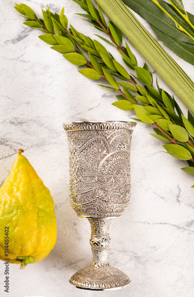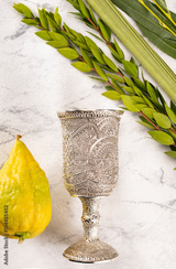 Symbols of Jewish Sukkot festival. The lulav and kiddush cup on marble background.