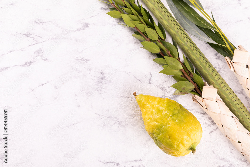 Symbols of Jewish Sukkot festival. Banner with lulav and a text space.