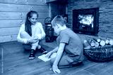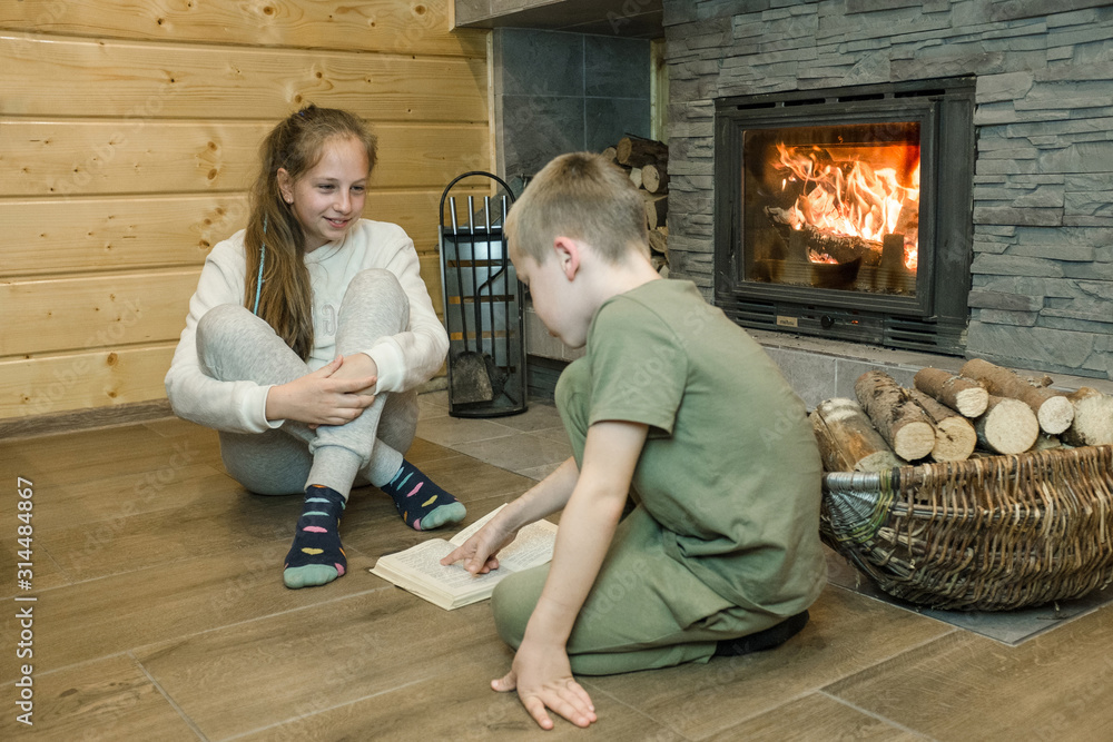 Two child sitting near fireplace in home and reading book. Holidays atmosphere.