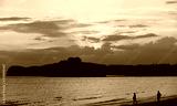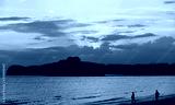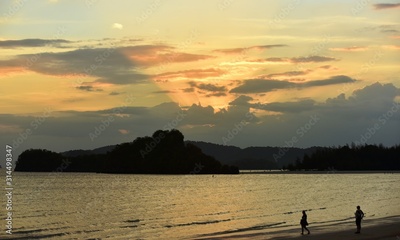The silhouette of tourists at the sandy beach and the light after the sunset before dark