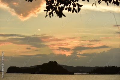 The silhouette of tourists at the sandy beach and the light after the sunset before dark