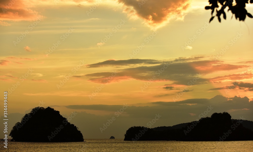 The silhouette of tourists at the sandy beach and the light after the sunset before dark