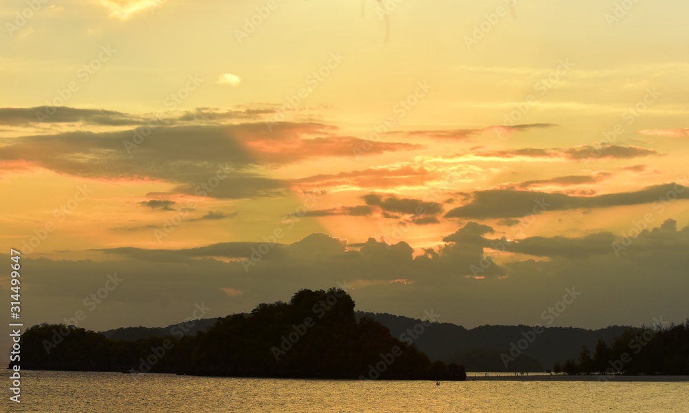The silhouette of tourists at the sandy beach and the light after the sunset before dark