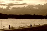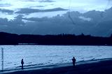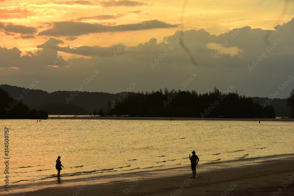 The silhouette of tourists at the sandy beach and the light after the sunset before dark