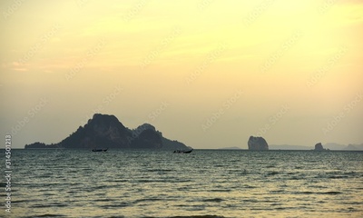 The silhouette of tourists at the sandy beach and the light after the sunset before dark