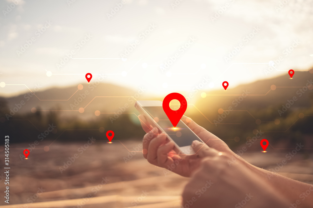 Woman hand using smart phone on top of mountain with navigator location point abstract background. Technology business and travel adventure concept.