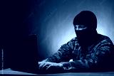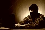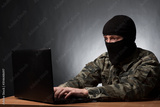 Masked cyber terrorist in military uniform hacking army intelligence