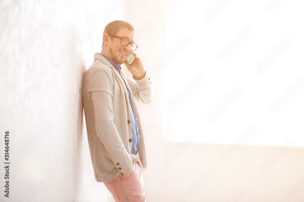 Portrait of a handsome man standing near window and talking on the phone