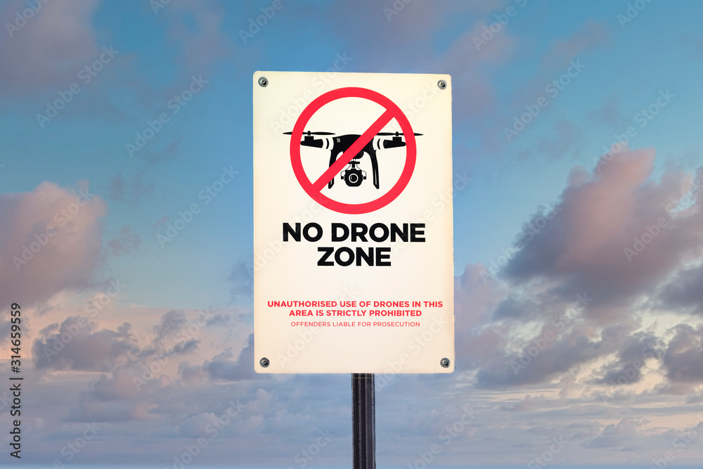 Drone in sky sign at British International Airport flying not allowed or permitted air zone uk