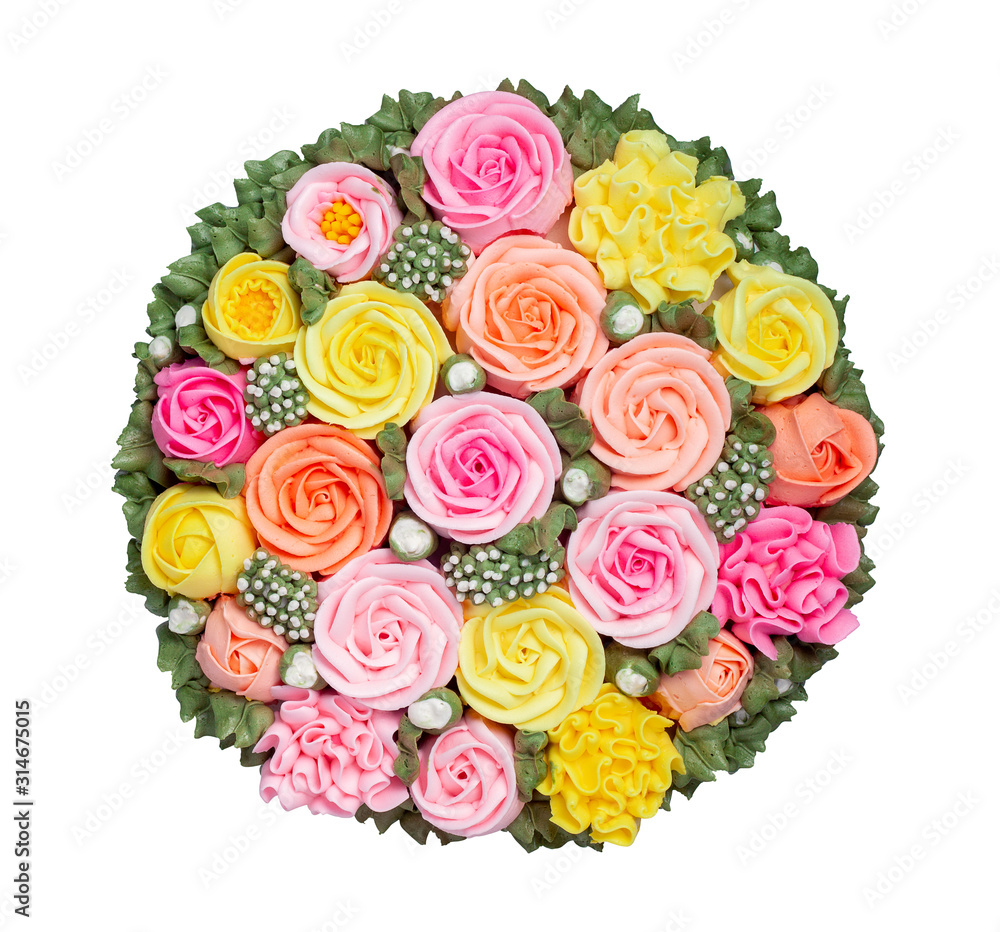 Top view of colorful and beautiful cake topping decoration in roses pattern on white background with clipping path