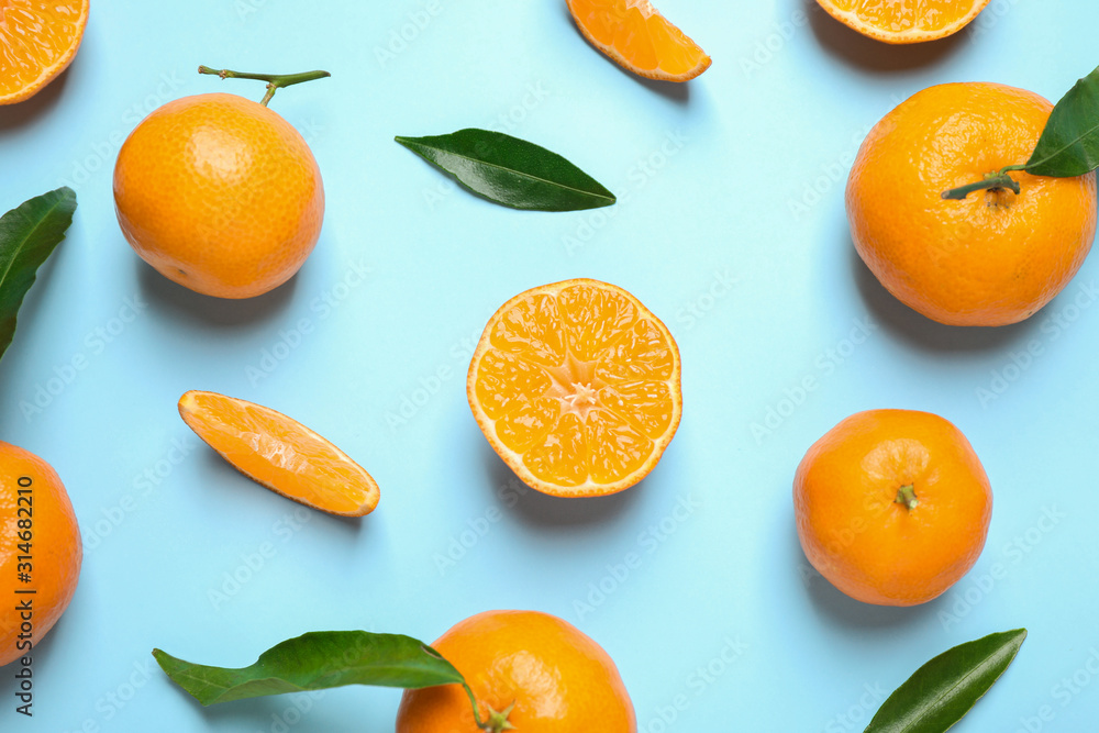 Flat lay composition with fresh ripe tangerines and leaves on light blue background. Citrus fruit