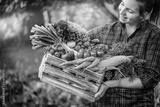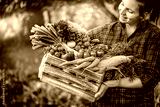 Farmer woman holding wooden box full of fresh raw vegetables. Basket with vegetable (cabbage, carrots, cucumbers, radish, corn, garlic and peppers) in the hands.