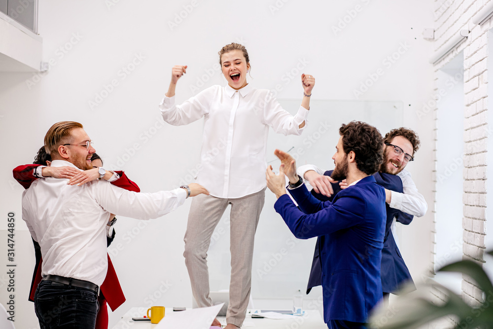 young successful business team enjoy, dance on table after work. confident workers in formal wear celebrating good job, completion of project