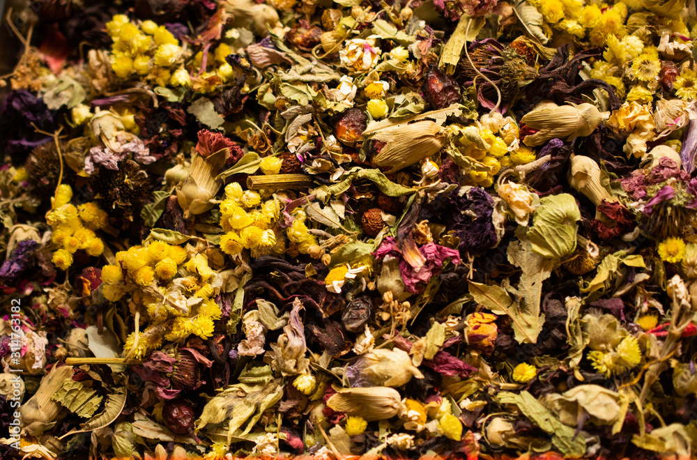 Dried tea, fruits, herbs, flowers at Istanbul Spice Bazaar