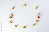 Chinese boy girl doll figurine money syce ingot gold on white background copy space