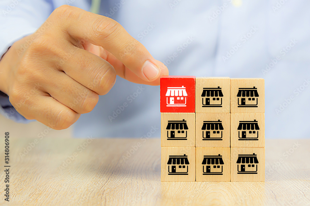 Franchise business,Businessman hand choose reg color wooden toy blog stacked with franchise marketing icons Store.