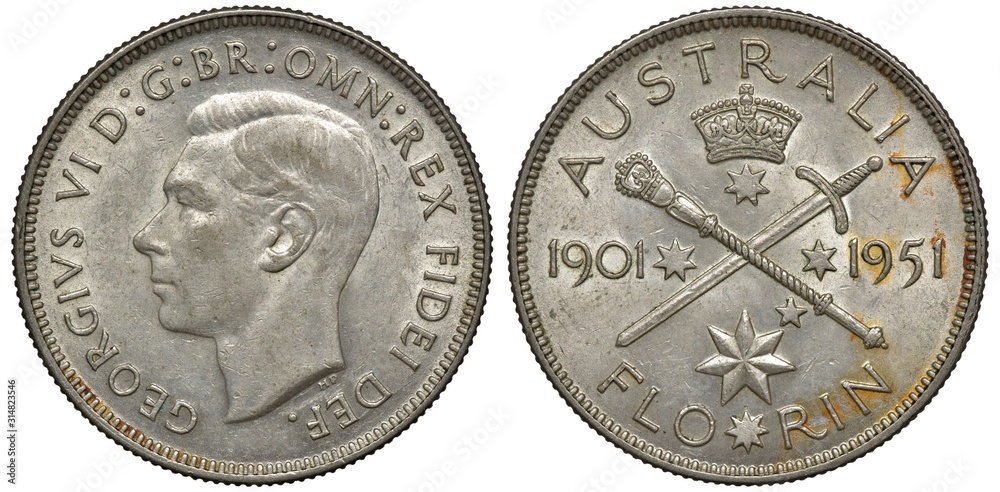 Australia Australian silver coin 1 one florin (two shillings) 1951, head of King George VI left, crossed scepter and sword among stars, dates flank, crown above,