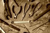 Old tools equipment on wood table background, engineering concept