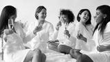 Smiling girls have fun drink champagne at hen party